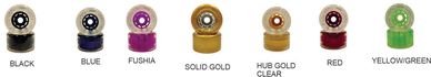 mm 78A. Hub colors Black, Blue, Red, Fushia, Gold, Yellow-Green all with clear wheels, Solid Gold.